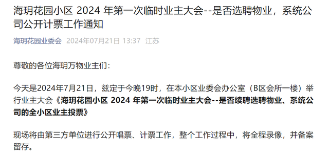 本年7月下旬,海玥花园举办了本年第一次暂时业主大会,就是否续聘选聘物业、科技体系服务企业向全小区业主建议投票表决。投票表决后,小区对外宣布选聘物业服务企业及科技体系服务企业公告。